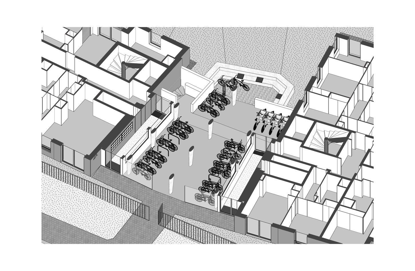 Chaque bâtiment contient un généreux espace vélos sous pilotis au cœur des circulations centrales d’accès aux différents halls, avec une terrasse conviviale de réparation vélos.